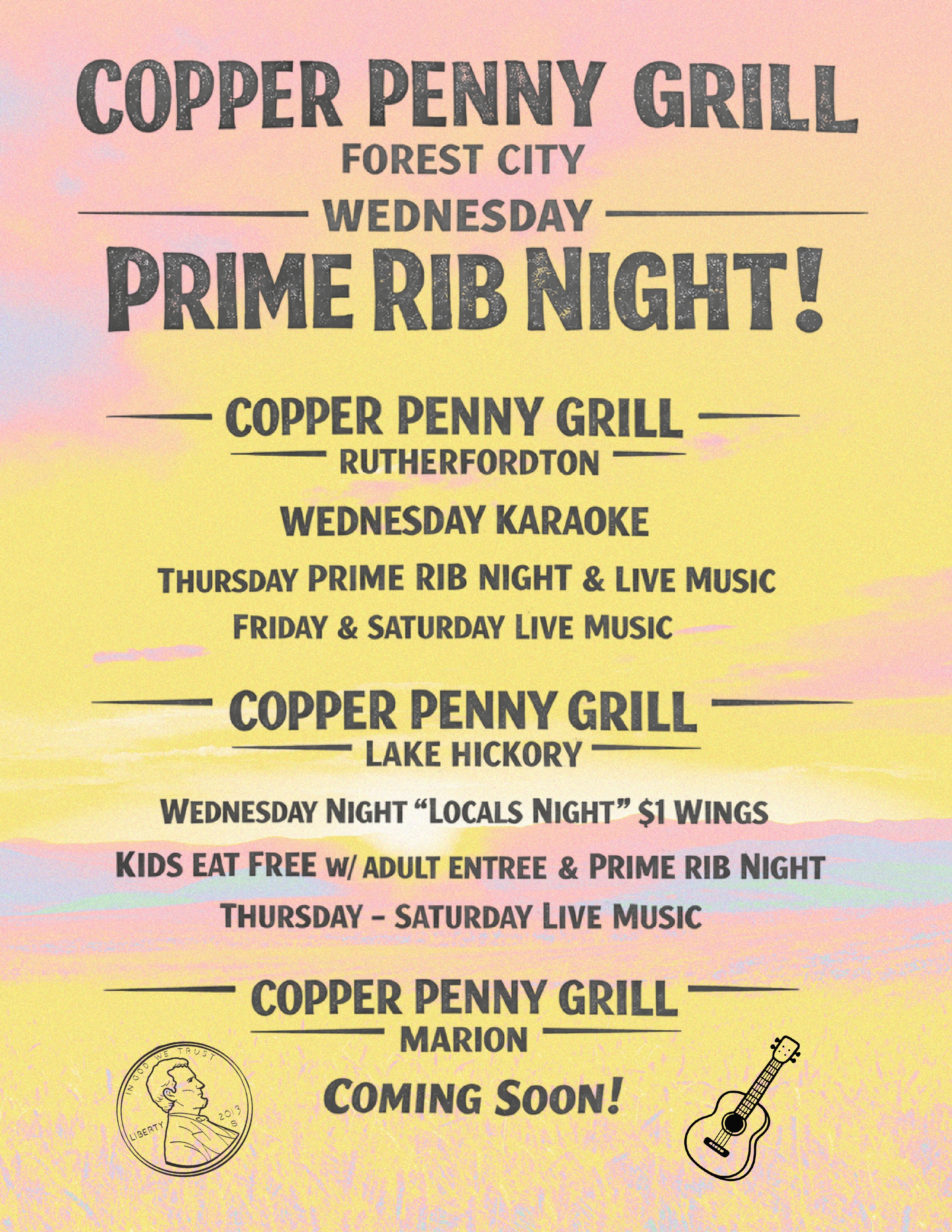 Discover weekly specials and live music at all Copper Penny Grill locations—and get ready to welcome Copper Penny Grill Marion, coming soon!